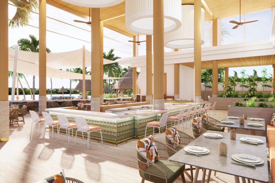 Hôtel de luxe moderne avec lobby, boutiques, 5 restaurants, beach grill, bar à tapas et 4 piscines (dont une pour les enfants). Sur l'île aux Chats, l'île privée de l'hôtel, se trouvent une partie des villas, 3 restaurants et 3 plages. En plus, une autre plage exclusive avec restaurant se trouve sur l'île aux Cerfs. Un grand spa avec 12 salles de soins construit sur pilotis dont 8 salles de soins doubles avec une magnifique vue sur le lagon et les mangroves complètent l'infrastructure du resort.