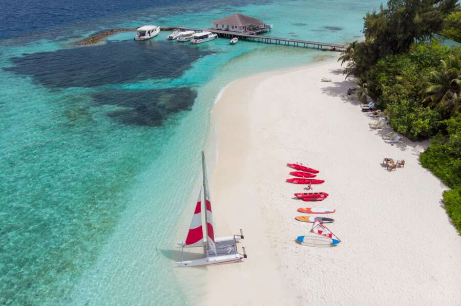 Le temps s'écoule au rythme des vagues, une légèreté décontractée flotte dans l'air. Soigneusement rénové et remis au goût du jour, «ERI Maldives» accueillera ses premiers hôtes en novembre 2025. Sur seulement 150 x 300 mètres, une petite île paradisiaque se déploie, entourée d'un monde sous-marin spectaculaire. Que ce soit en pratiquant la plongée ou la plongée tuba, les poissons de récif aux couleurs chatoyantes, les tortues tranquilles et les gracieuses raies-aigles offrent des rencontres inoubliables. On y trouve ce que beaucoup recherchent: un petit paradis sans prétention, un endroit pour se détendre, s'évader et se sentir bien.