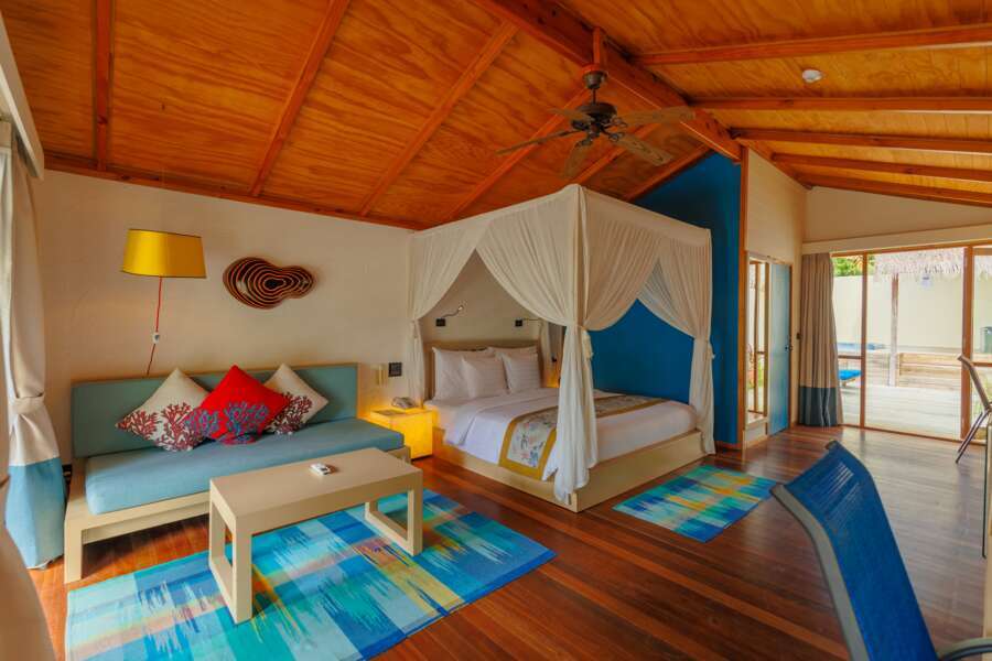 Les 44 Jacuzzi Water Villas et les 33 Ocean Villas (85 m²) sont construites dans le lagon et reliées à l’île par un ponton. Elles offrent une vaste chambre à coucher, un coin salon, une machine à café, un jacuzzi dans la salle de bain semi-ouverte et l'accès direct à la mer.