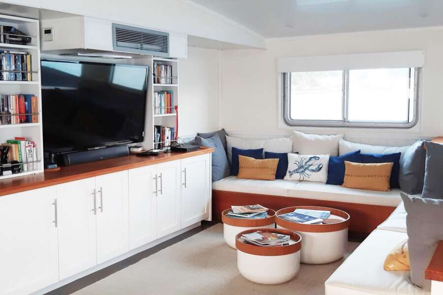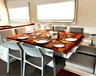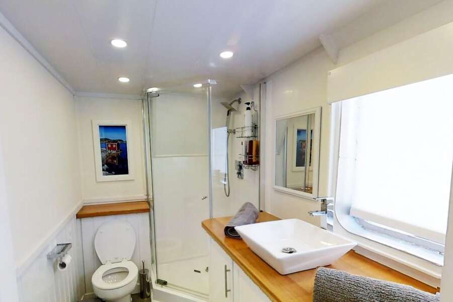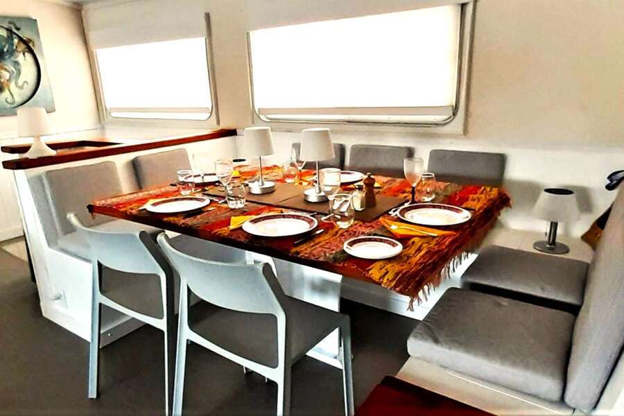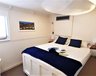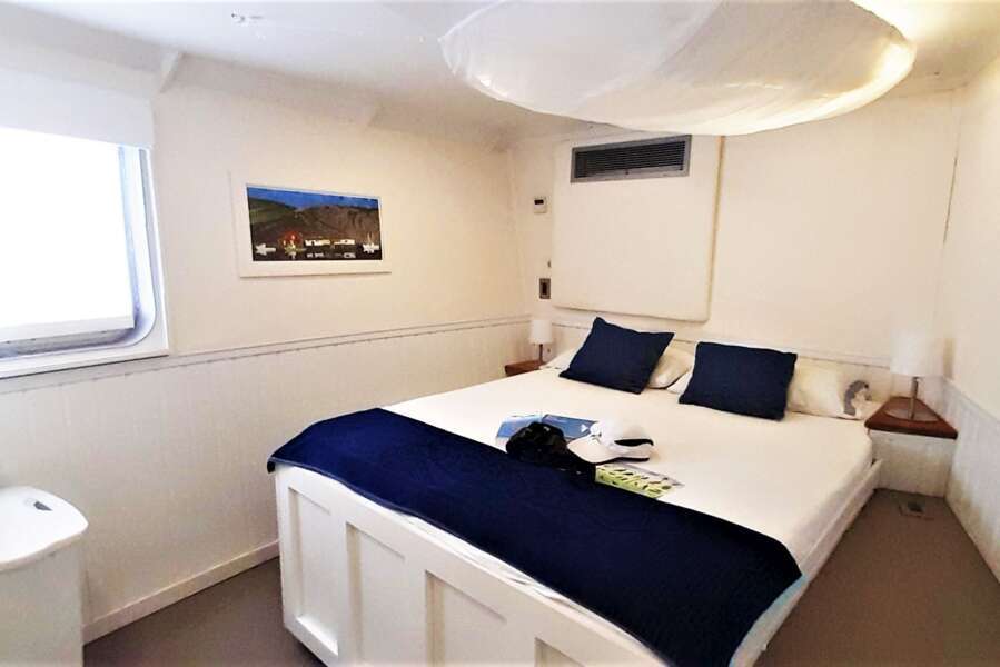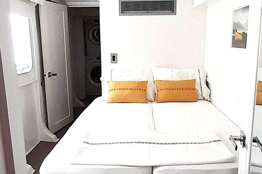 Les 3 cabines lumineuses et modernes (14 m²) se trouvent sur le pont principal et le pont inférieur et disposent toutes de lits doubles, de fenêtres, d'une salle de bains privée avec douche, de la climatisation, d'un ventilateur et de suffisamment d'espace de rangement.