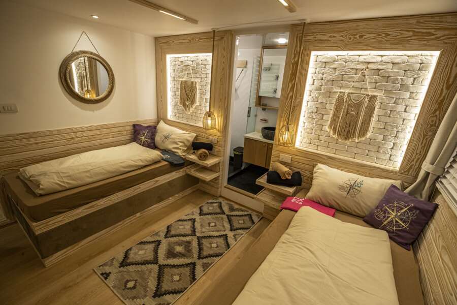 Le «Soul of Omneia» peut accueillir 29 passagers au total dans 15 cabines spacieuses et aménagées avec goût. Toutes disposent de la climatisation, d’une douche/WC, d’un réfrigérateur, d’un sèche-cheveux, de serviettes, de serviettes de bain de soleil et de peignoirs. Au pont inférieur se trouvent 5 cabines à deux lits, ainsi qu’une suite avec un lit double. Cinq autres cabines à deux lits, deux suites avec lits doubles et une cabine individuelle se trouvent sur le pont principal. La suite principale se trouve sur le pont soleil.