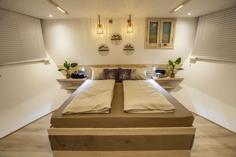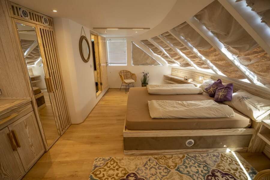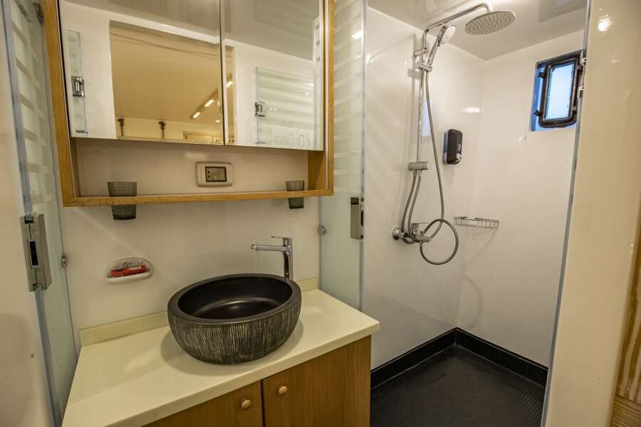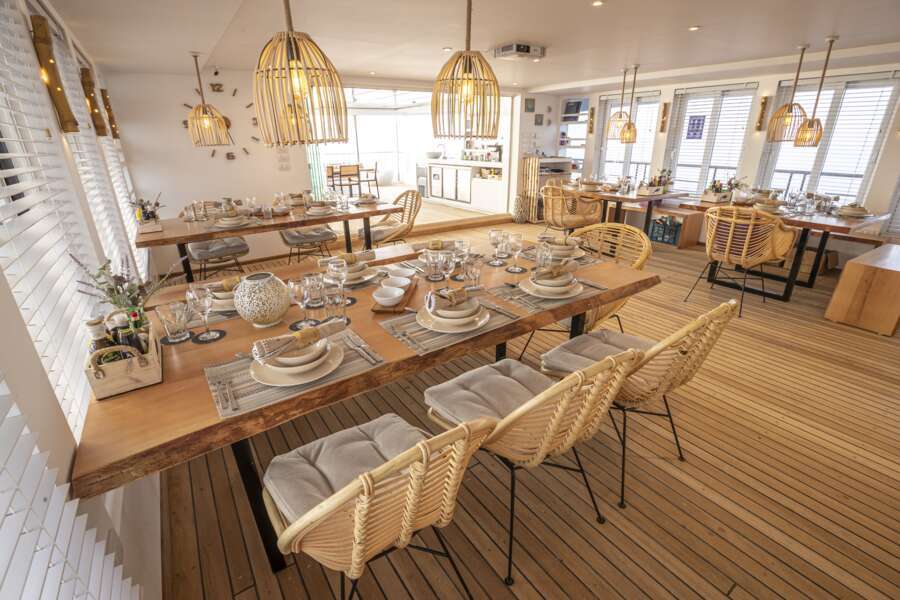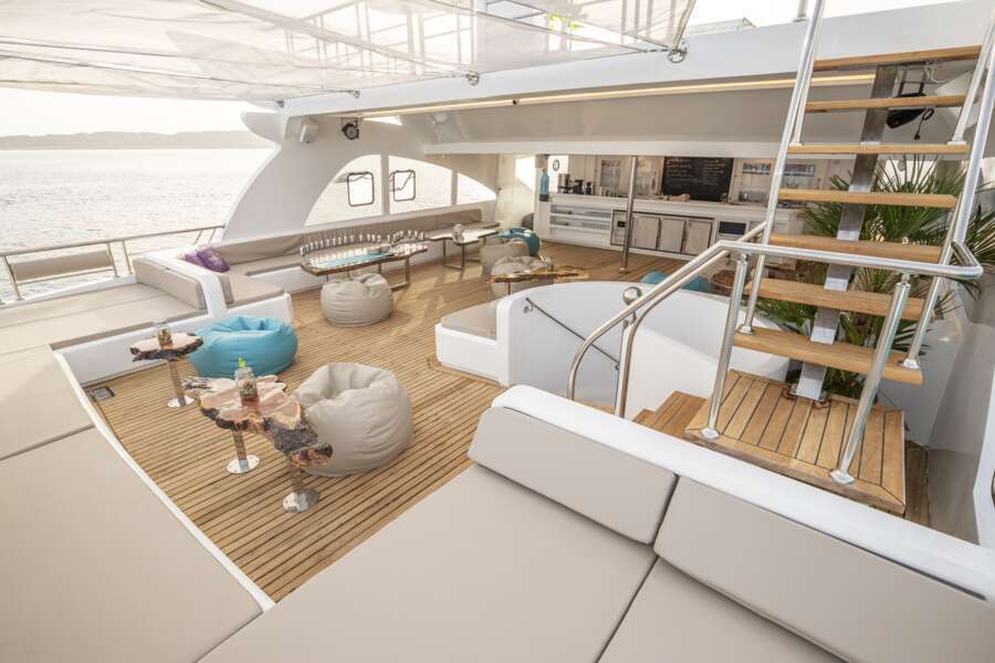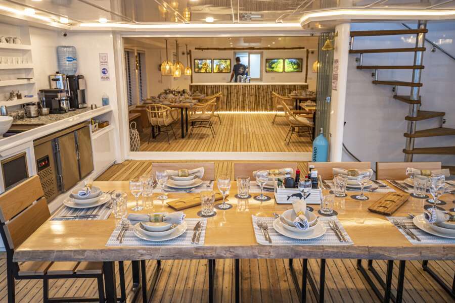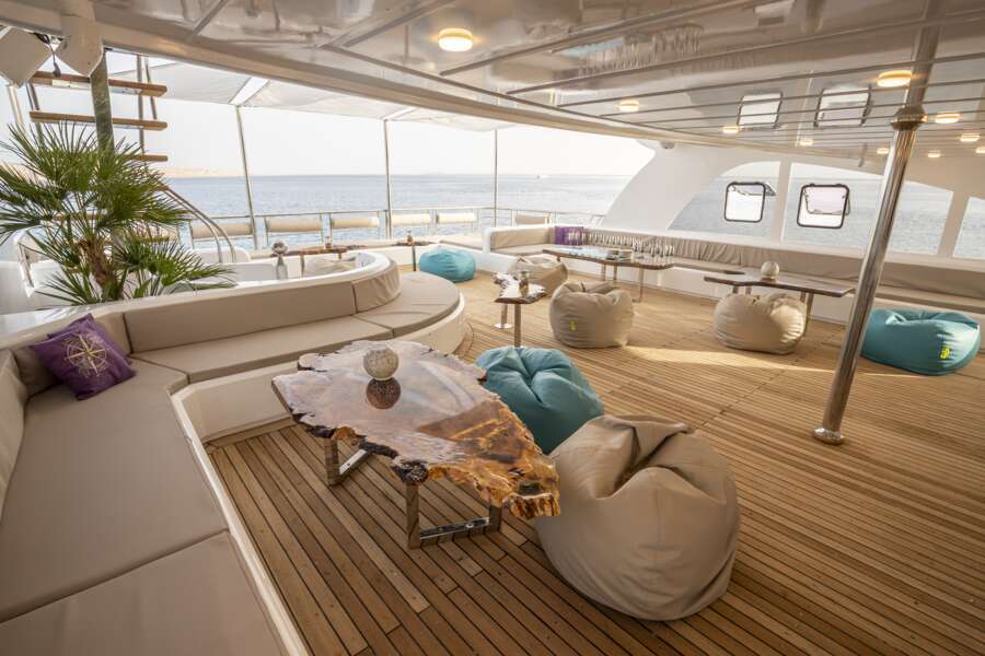 Sur le pont principal se trouvent, en plus des cabines des passagers, la grande plateforme de plongée avec douches, toilettes et un grand espace photo. L’espace repas sur le pont supérieur offre toujours une vue imprenable sur la mer pendant les repas. À l’arrière du pont supérieur, un lounge extérieur avec des sièges confortables et des transats invite à la détente. D’autres transats se trouvent sur le highdeck et le flydeck. Il y a même un jacuzzi sur le pont supérieur, le flydeck. Pour se détendre après les plongées, il est possible de réserver des massages.