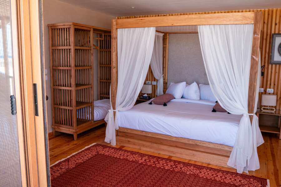 Les 25 Royal Tents (25m²) sont situées directement sur la plage et sont équipées de ventilateur, minibar, poufs et table, ainsi que d'un coin salon devant la tente.