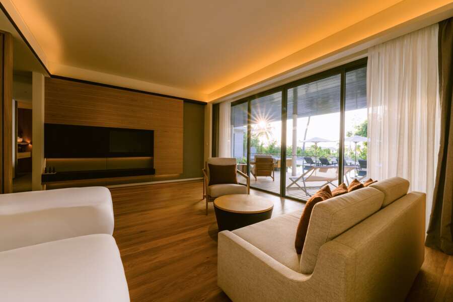 Die 25 Beach Pool Villas und 16 Sunset Beach Pool Villas (beide 202 m²) sind identisch eingerichtet, liegen direkt am Strand, verfügen über ein halboffenes Badezimmer und unterscheiden sich nur durch ihre Lage.