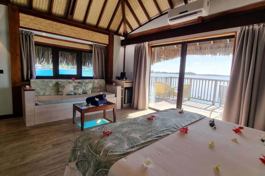 Die 4 End of Pontoon Overwater Bungalows (38m²) liegen am äusseren Ende des Stegs und bieten eine atemberaubende Aussicht auf die Lagune von Bora Bora.