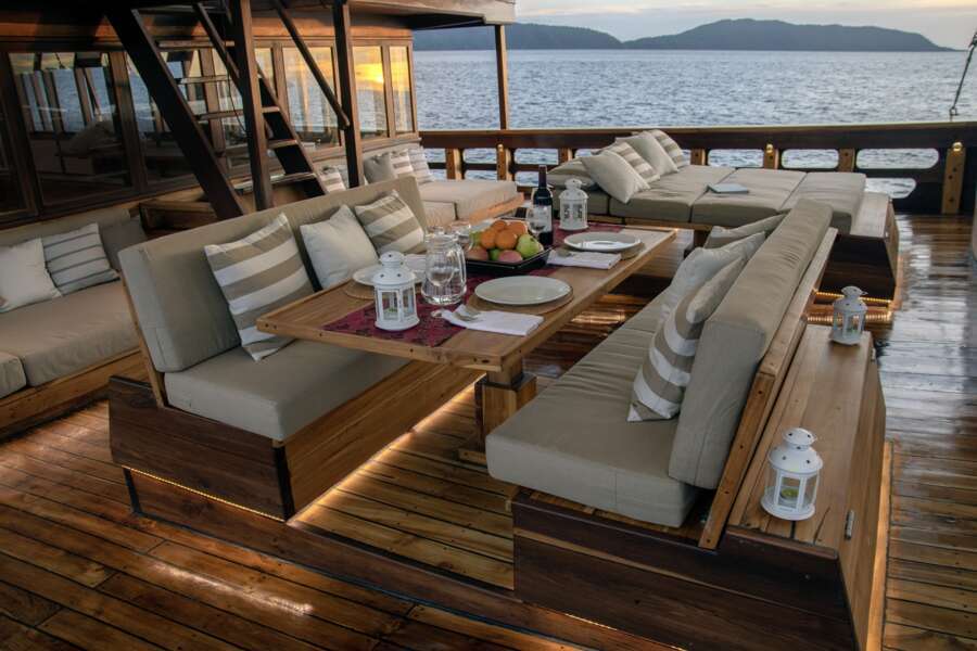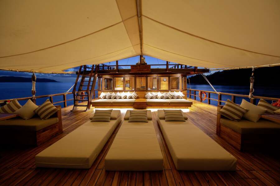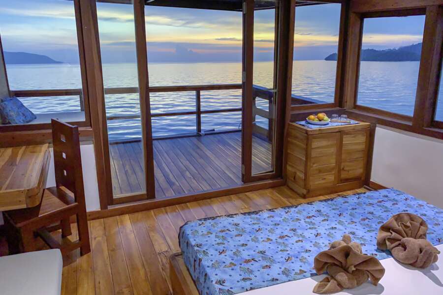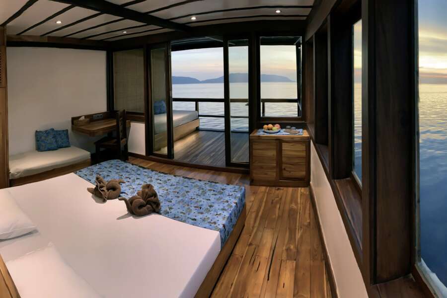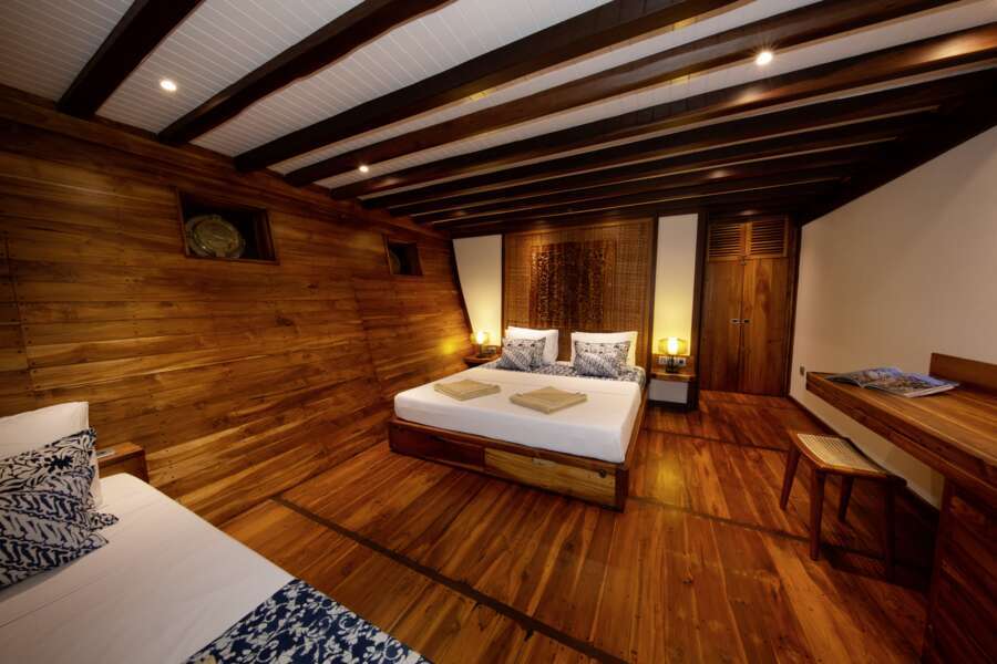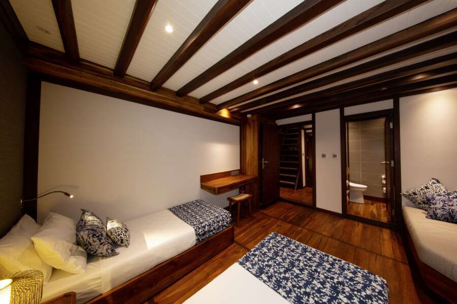 Die vier grosszügigen Kabinen im Unterdeck, zwei mit Doppelbett und zwei mit Einzelbetten, bieten ein hohes Mass an Komfort. Auf dem Haupt- und Oberdeck befinden sich je zwei Master Kabinen mit Doppelbett. Sie sind sehr geräumig und bieten einen privaten Balkon mit Liegeflächen. Alle Kabinen verfügen über ein privates Badezimmer mit Dusche und WC.