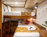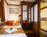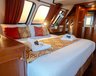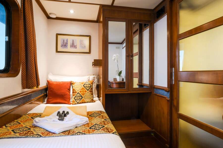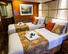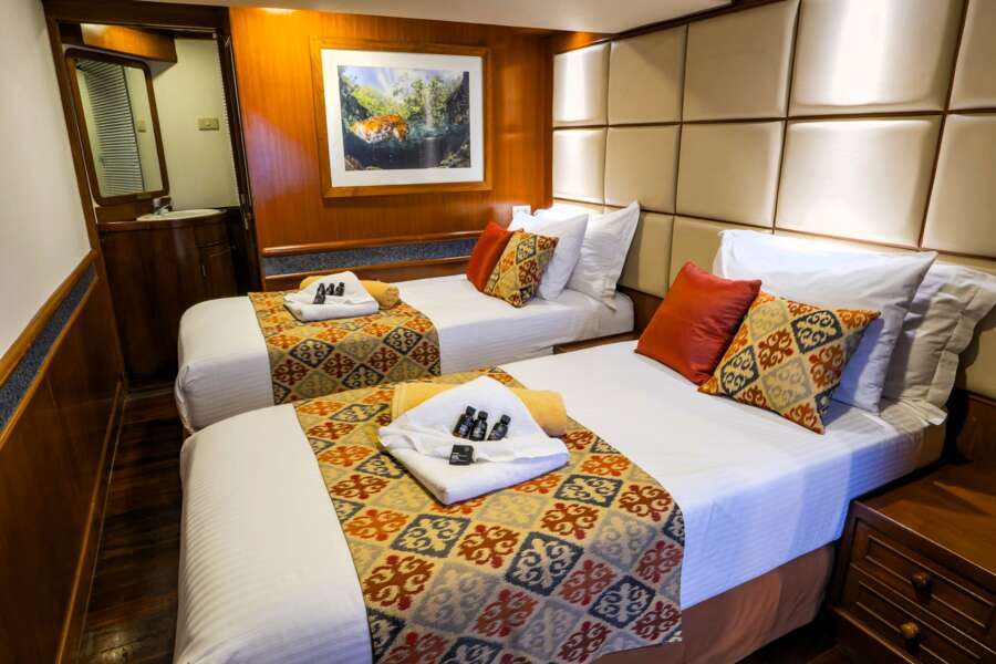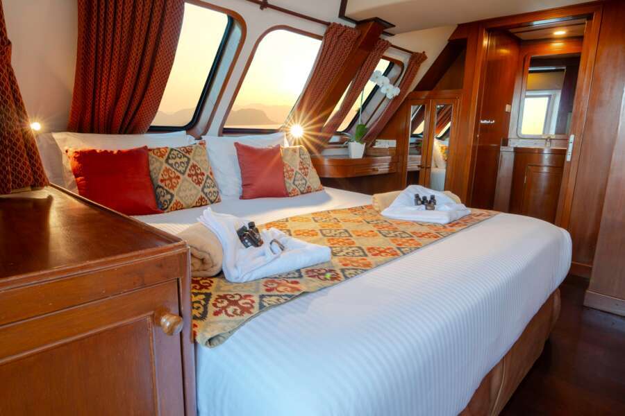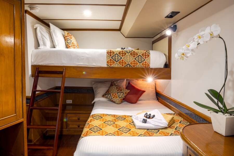 Die Masterkabine mit Doppelbett befindet sich auf dem Oberdeck, 4 Deluxe-Kabinen (Doppel- und Einzelbetten) auf dem Hauptdeck. Beide Kategorien mit Panoramafenster. 2 Budget- abinen im Unterdeck mit Etagenbetten ohne Aussenfenster. Alle Kabinen mit eigenem Bad und TV/DVD.