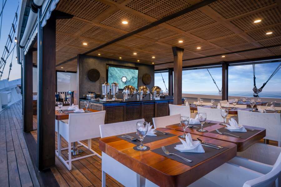 Das Schiff besteht aus total 3 Decks inklusiv einem 168 m² grossen Sonnendeck mit chill out Area. Zur Infrastruktur zählen 1 Restaurant mit internationaler Küche, Bar, Spa, Openair Kino, Bibliothek, Kameraraum mit Ladestation, Souvenir Shop und Wäscheservice.
