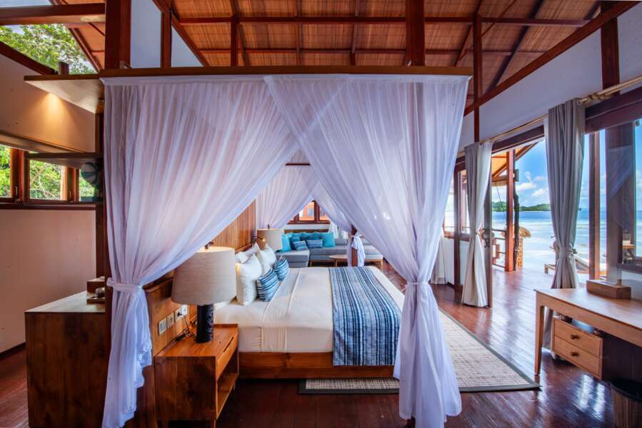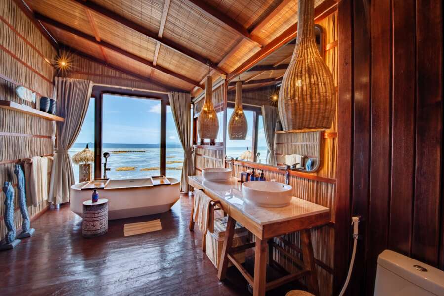 Die 12 Superior Overwater Bungalows (70 m²) bieten ein naturnahes Wohnerlebnis mit allen genannten Annehmlichkeiten.