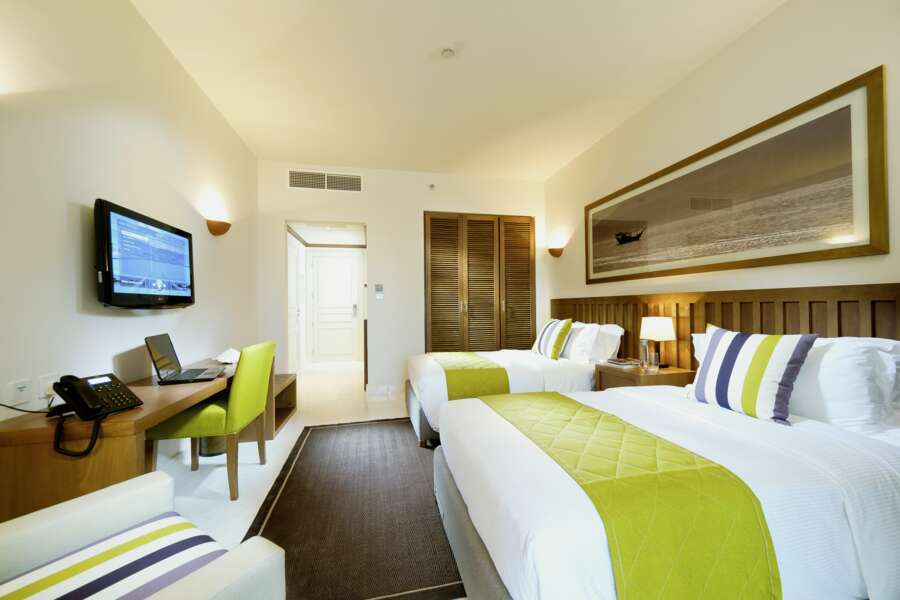 Die Suiten (54m²) sind mit zusätzlichem Wohnzimmer und Nespresso Maschine, begehbarem Kleiderschrank sowie Dusche ausgestattet. Die Marina Suiten haben einen herrlichen Blick auf die Marina und das Hajar Gebirge und die Deluxe Suiten Pool View